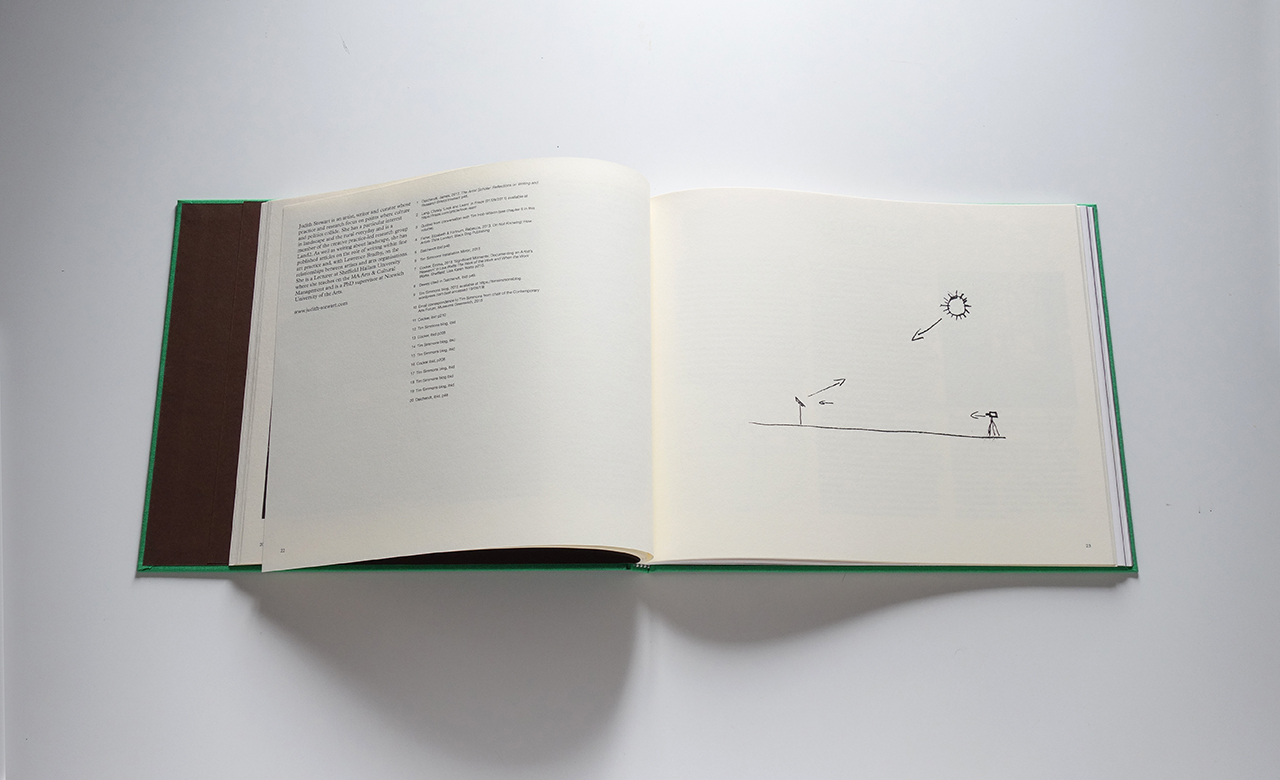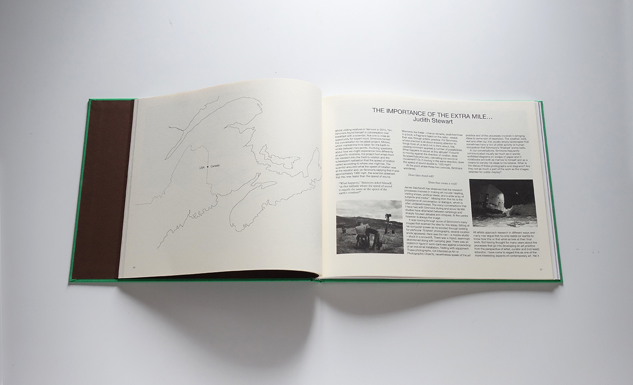 Over time, Simmons’s work has shifted from an interest in revealing hidden places to the revealing of hidden phenomena which affect our interpretation of place at specific times. He makes use of the tricks time plays with us: the dominance of light, the role of the sun and movement of the earth. His more performative works, such as Mirrors, reflecting back light from the sun, or One Mile, where flashing lights are set up to relate to the earth’s movement, experiment playfully with phenomena of light, movement of light, shifting positions of the sun and reflections. He uses the tools, not only those of production, but of the measurement of time and place, to accentuate the moment, to calculate the point of its greatest stillness, or to encapsulate its minutest movement…He composes little scenes and episodes where in fact nothing happens except for the place itself”.